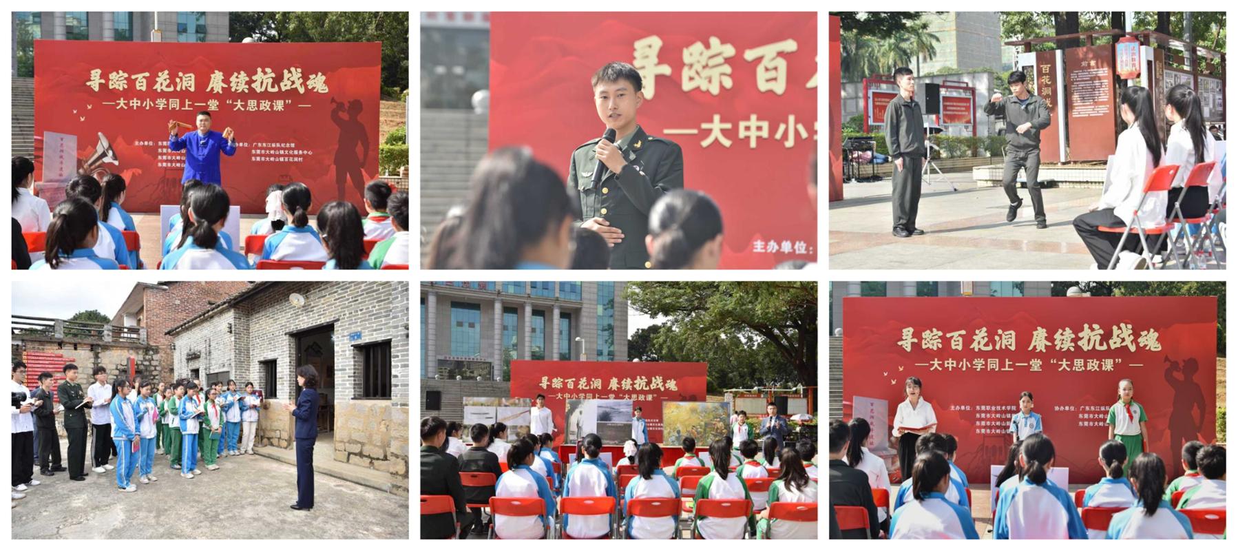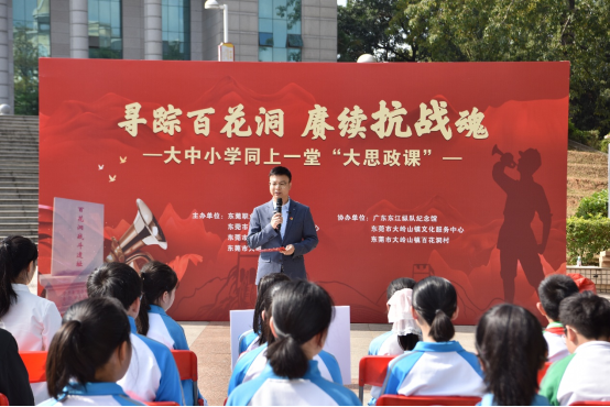 12月20日上午,大岭山百花洞村广场誓言铿锵、歌声嘹亮。来自我校以及大岭山镇新风中学和中心小学的师生代表,与广东东江纵队纪念馆、大岭山镇教育管理中心、文化服务中心、百花洞村一道,共同开启“寻踪百花洞,赓续抗战魂——大中小学同上一堂‘大思政课’”实践教学活动。
